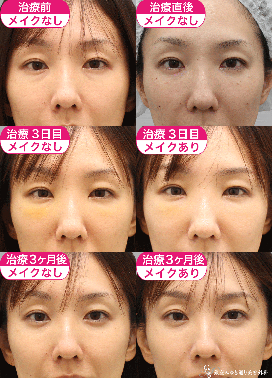 こちらは40代女性の症例です。3日目は腫れ・むくみ・内出血がありますが、この程度ですとほとんど分からず、メイクでカバーできています。