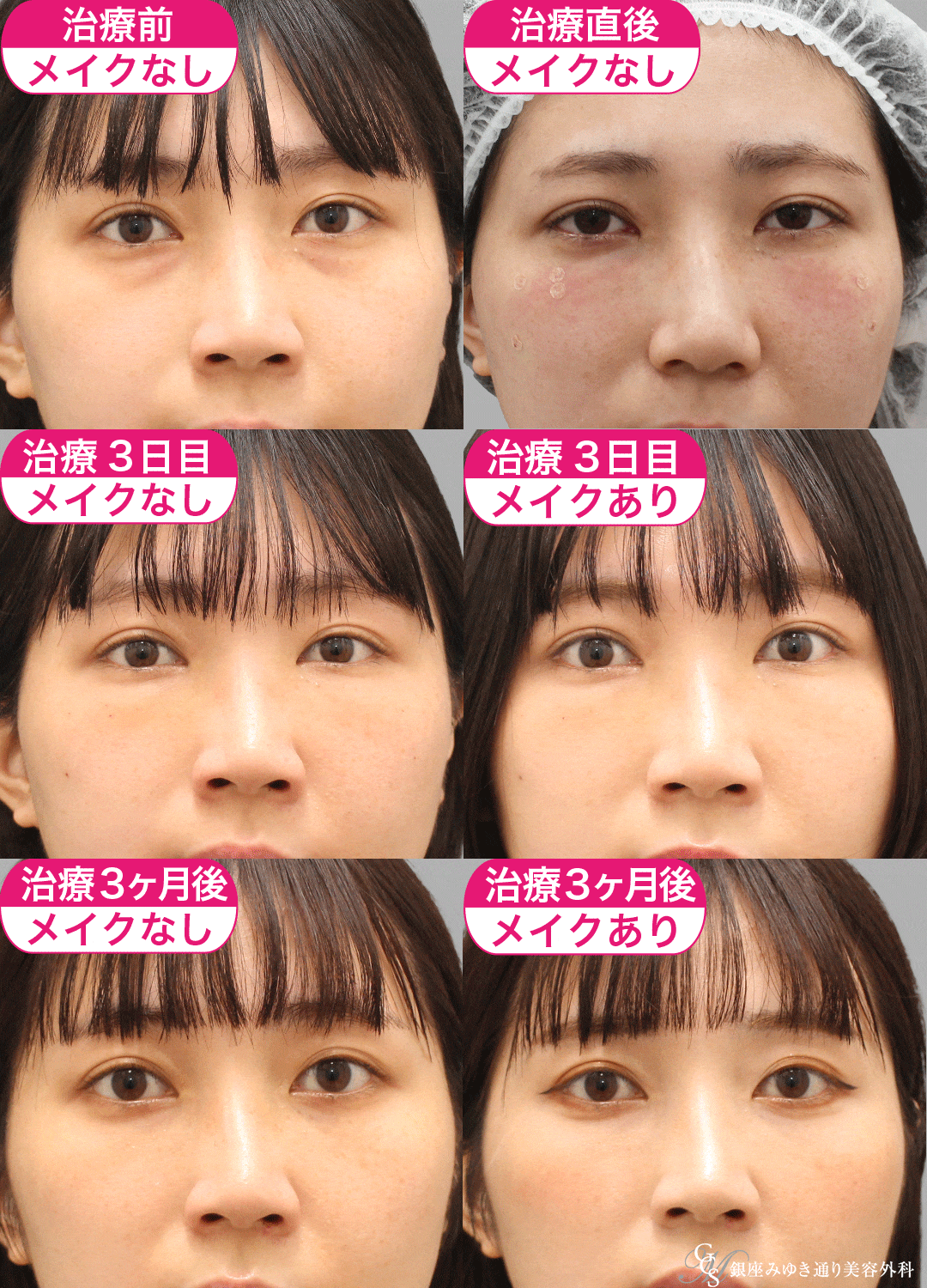 当院が推奨している「週末クマ取り」では、治療後3日目ですでにかなり腫れが少ないので、ほとんどの方はメイクで十分カバーできます。この症例写真の3日目の「メイクあり」の写真を見て、クマ取り手術3日目だと気づけますか?「ちょっとむくんでいるかな?」程度にしか見えないと思います